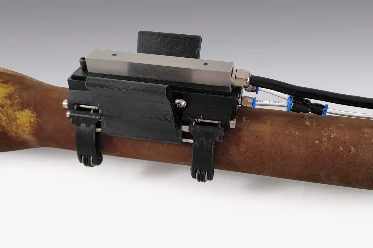 The small-diameter corrosion scanner is super easy to attach to the scan surface. The easy-to-use hair clip action has hidden abilities. When opening to lift off the probe, two proximity switches both increment one encoder count on a second encoder channel, for indexing the scans being performed, and also disable the rotary encoder if it was rotating while moving the scanner to the next position.