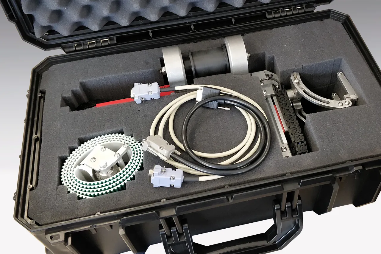 Three axis represent Circumferential Axis, Squint Axis and Probe Offset Axis. Powerful neodymium magnetic wheels ensure secure attachment to ferritic test surfaces. Additionally, a belt attachment system can be used for non-ferritic nozzles, where the design of the belt allows complete revolutions without obstructions. Can be installed and used by a single operator.